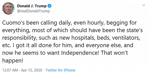 4月14日,特朗普在推特上写道:“科莫每天,甚至每小时都打来电话求我,其中很大部分应该是州的责任,比如新的医院、床位、呼吸机等。我全都帮他搞定了,现在他似乎想闹独立!那不可能!”