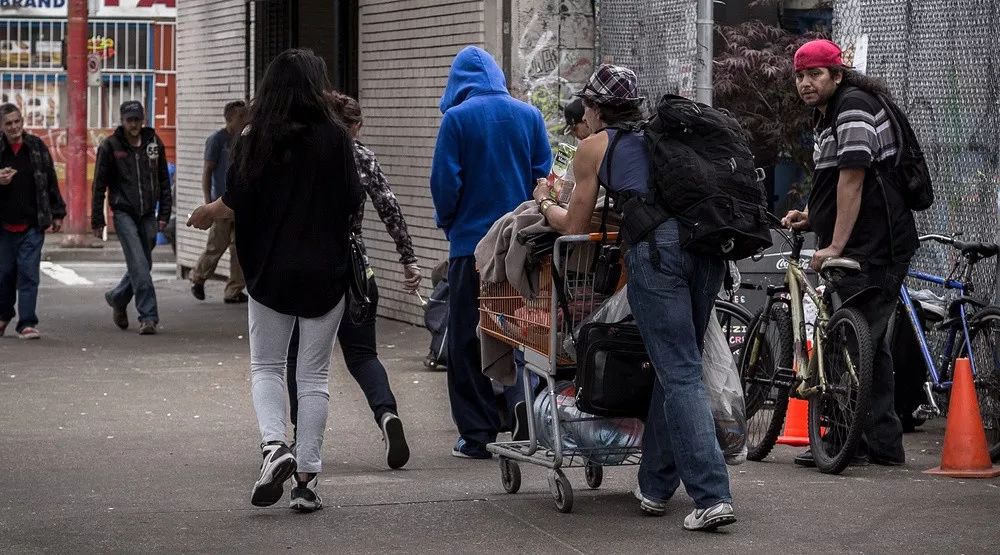 最令人侧目的,是马路两旁人行道上的露宿者。每隔10米左右,就有一个他们的地盘,隐隐透着一股尿骚味。只见他们一个个眼神涣散,躺在脏兮兮的被褥上,有的还在吞云吐雾抽大麻,与周围的高档商业区和现代建筑极不协调。