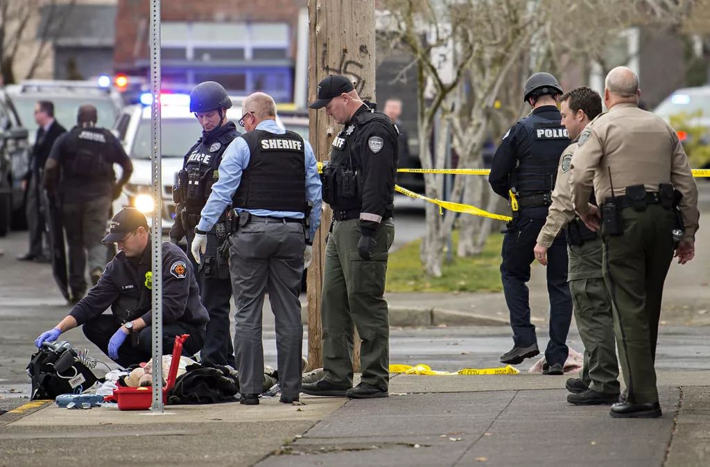 正愁着附近没什么选择,我已经从大厦的门厅,一步跨到了Granville大街的行人道上,却猛地一眼瞥到街边马路上,横七竖八停着几辆警车,警号灯还在不断闪烁,周围十多个吃瓜群众也围成了半圆,不少人正举着手机拍照。