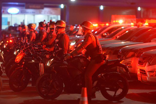 泰国曼谷的警察集结准备执行宵禁任务