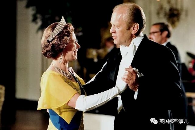 1976年7月7日,在白宫为她举行的国宴上,女王身穿黄色晚礼服与福特总统共舞。