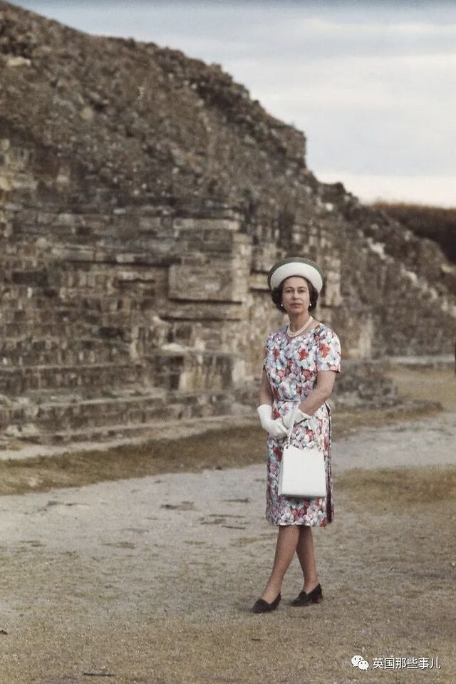 1975年2月,伊丽莎白女王在对墨西哥进行国事访问时,身着印花裙装,参观了一座古老的金字塔。