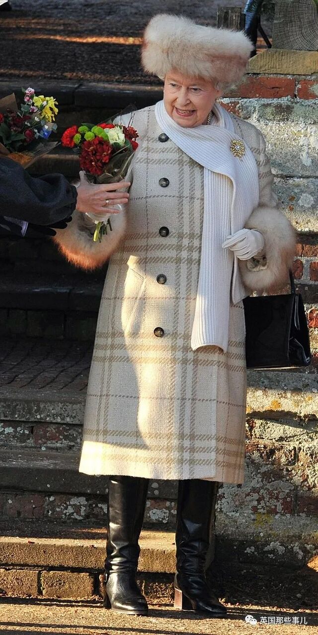 同天,女王还穿了一件镶有毛皮边的格子大衣,戴上了毛皮帽子,用向日葵胸针别住了羊毛围巾。