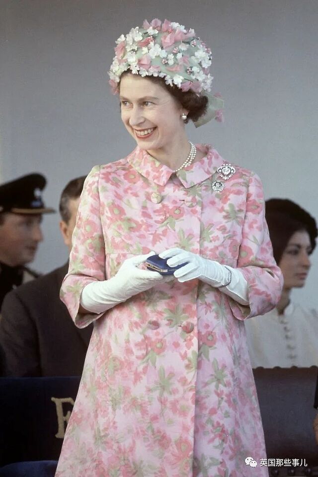 1967,女王在访问马耳他的皇室之行中,身穿粉色和绿色花纹双排扣大衣,十分活泼鲜艳。