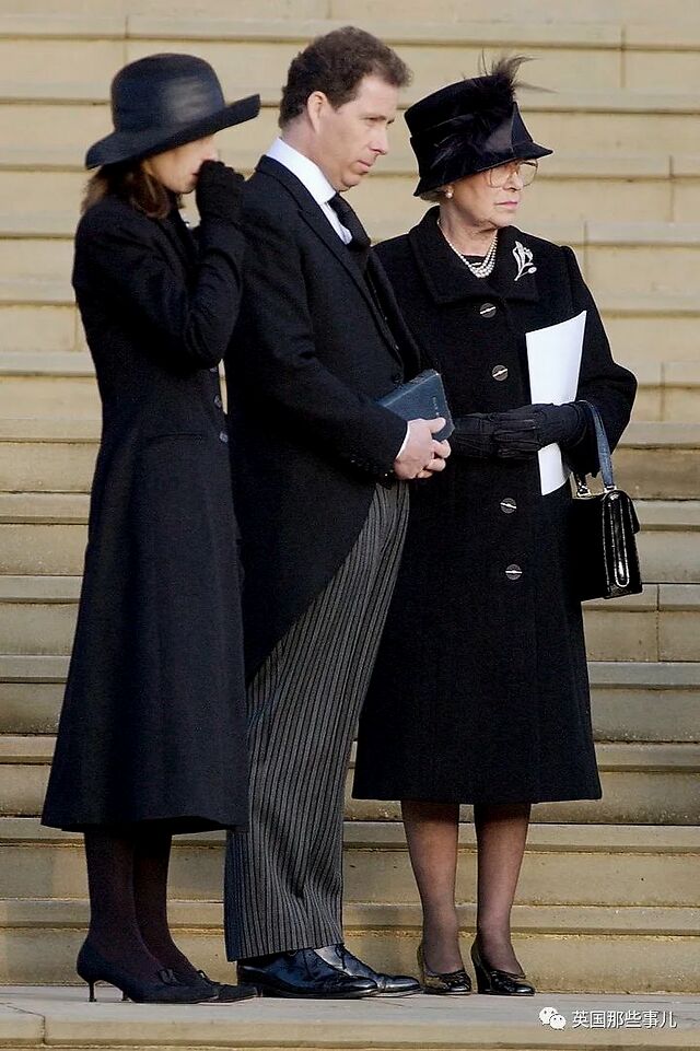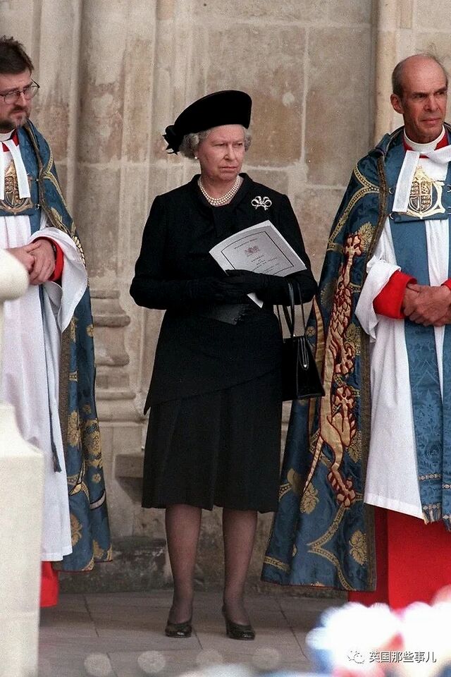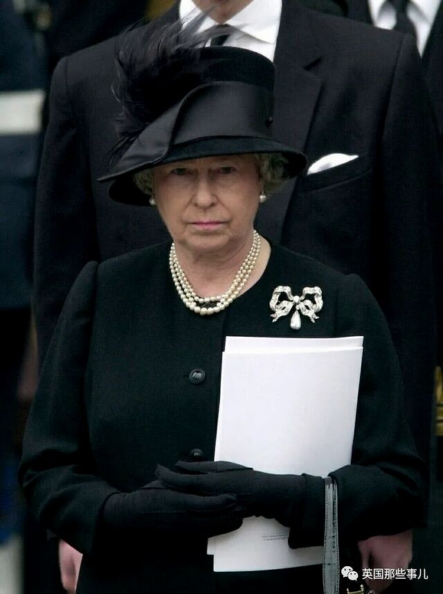 2013年4月17日,在前首相撒切尔的葬礼上,女王身着黑色的礼服,佩戴着维多利亚女王的蝴蝶结胸针。