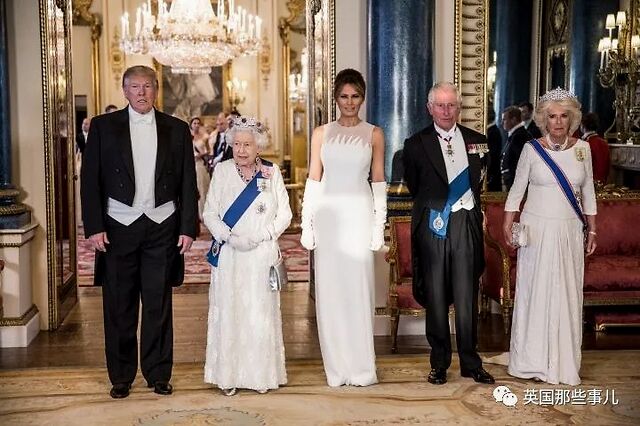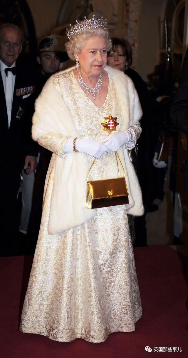 同天,女王换上了白色长袍,佩戴金色Launer手包和大不列颠及爱尔兰之女王冠出席国宴。