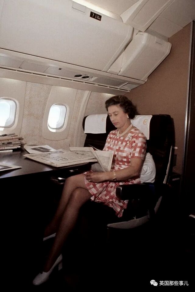 1977年11月,女王在加拿大和西印度群岛的旅行结束后,从巴巴多斯的布里奇敦乘坐飞机回国时,身穿印花裙读报。