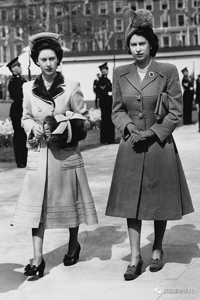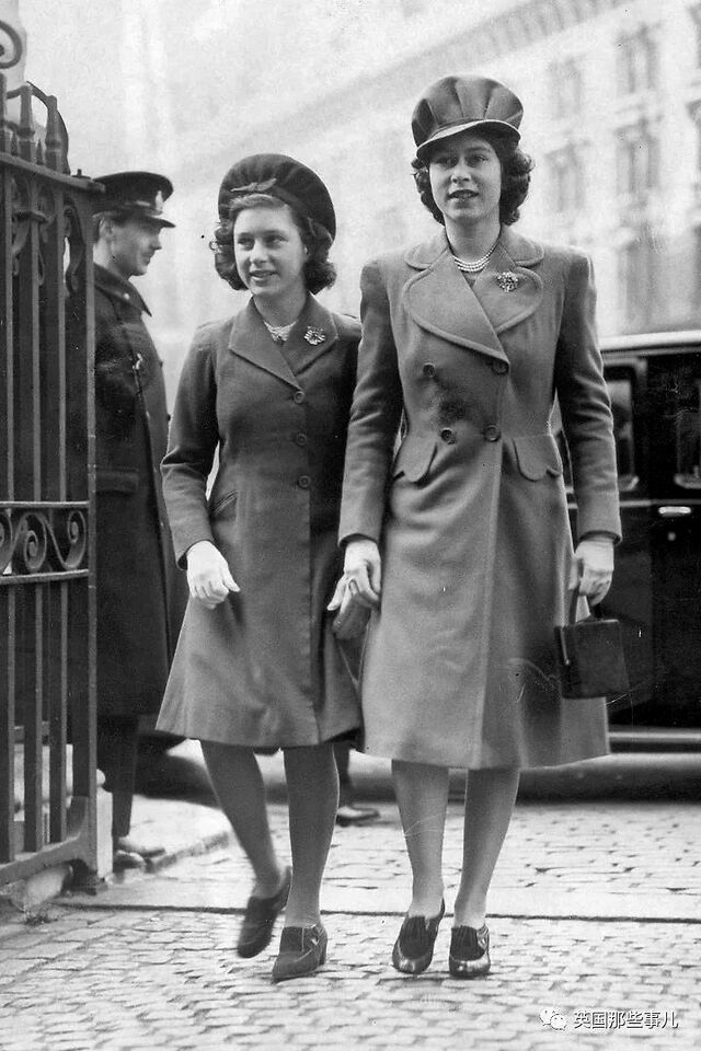 1944年2月,伊丽莎白和玛格丽特在威斯敏斯特大教堂参加婚礼,二人身穿双排扣大衣,头戴斗篷帽。