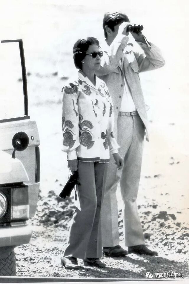 1979年7月,女王的非洲之旅。,在和安德鲁还有菲利普王子一起在赞比亚的琅格瓦国家公园探险时,她难得地穿着长裤亮相。