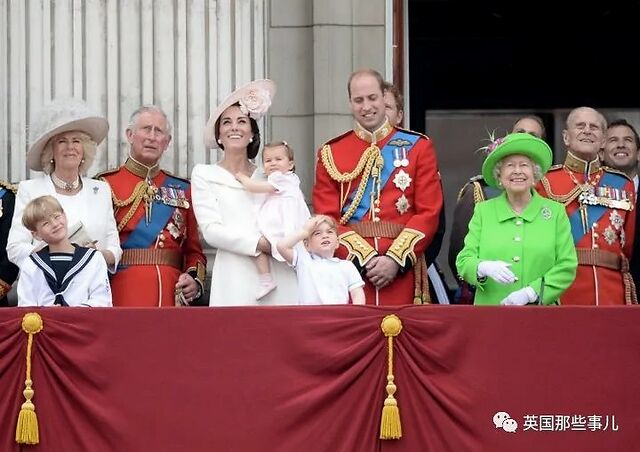2016年6月11日,女王在白金汉宫的阳台上与家人一起,身穿Stewart Parvin设计的绿色大衣,佩戴着卫队徽章,庆祝90岁生日。