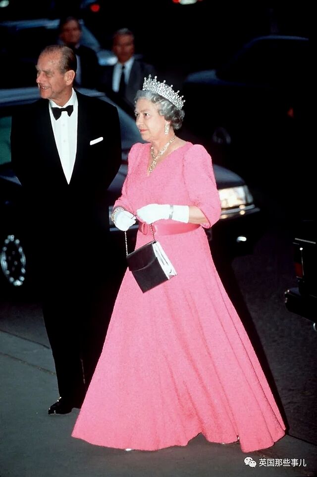 1963年6月,女王身穿珊瑚色晚礼服,佩戴着标志性的珍珠,与菲利普亲王一起出席在伦敦举行的活动。