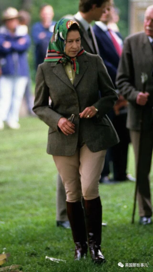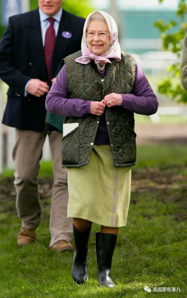 2012年5月11日,在皇家温莎马展上,女王脚踩威灵顿长靴,身穿格子花纹马甲和花呢短裙,头戴头巾。