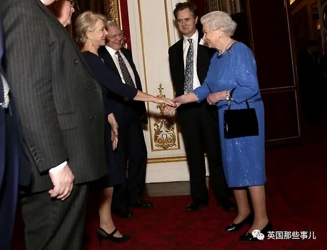 2014年2月17日,女王身穿蓝色礼裙出席白金汉宫戏剧艺术招待会,与演员Helen Mirren会面。