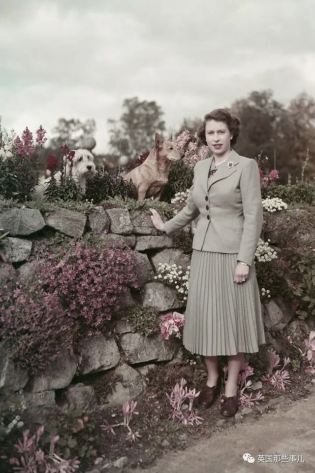 1952年9月28日,女王身穿单排扣西装外套和百褶短裙,与她心爱的狗狗在夏日住所--苏格兰Balmoral的家中合影。