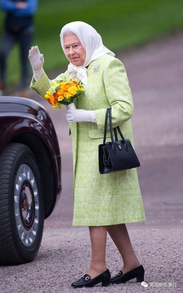 当天,女王裹上了白色的头巾,身穿青柠色呢子大衣,配上她最喜欢的黑色包包和鞋子。