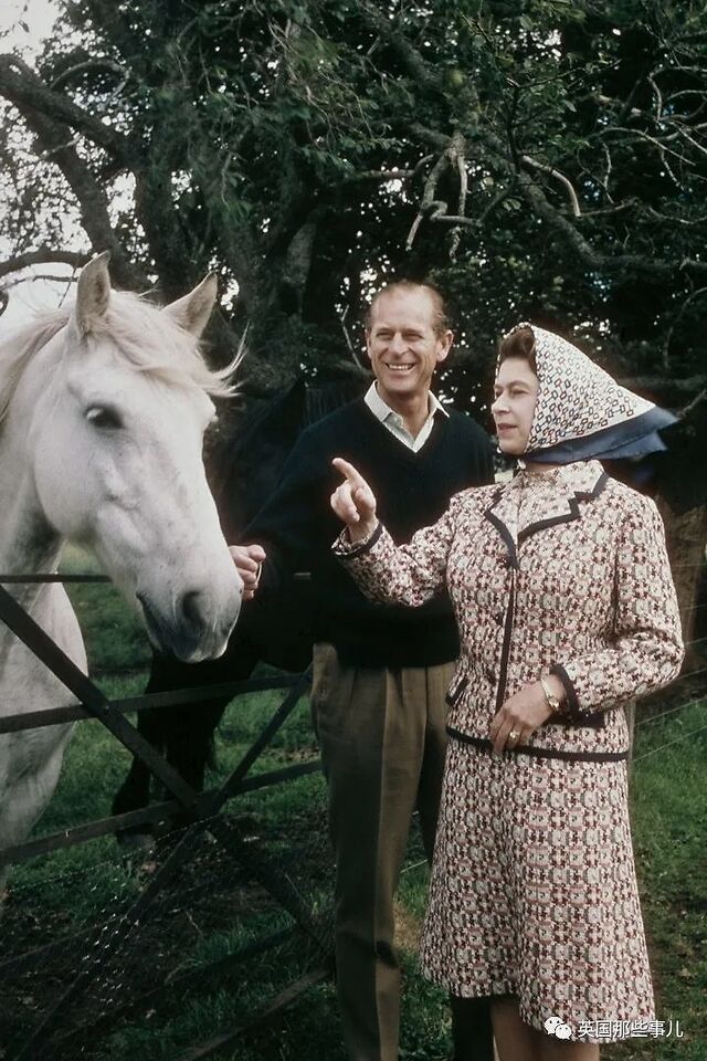 1974年在巴尔莫拉尔勒尔度假时,女王陛下穿着猫头领青色连衣裙与菲利普亲王坐在一起拍照。
