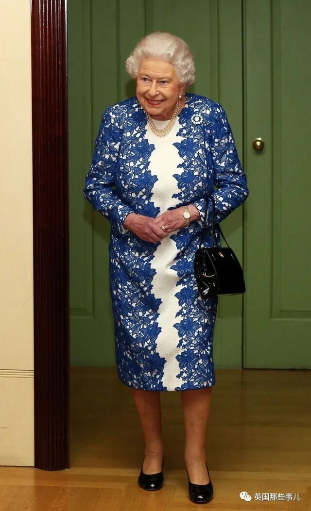 2017年2月21日,女王身穿白色和蓝色相间的蕾丝礼服出席伦敦的招待会,还有黑色漆皮手包。
