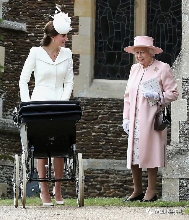 2015年7月5日,夏洛特小公主在桑德林汉姆庄园洗礼之后,身着婴儿粉套装的女王与推着婴儿车的凯特正在聊天。