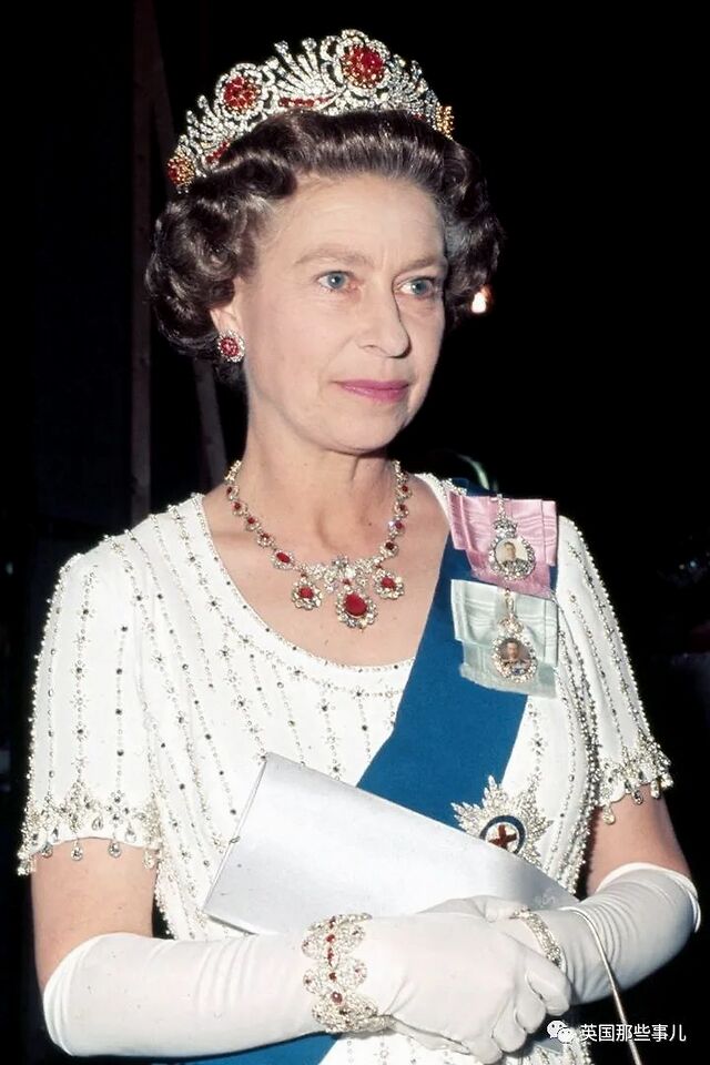 1977年5月,女王戴着红宝石头饰和项链参观皇家歌剧院。
