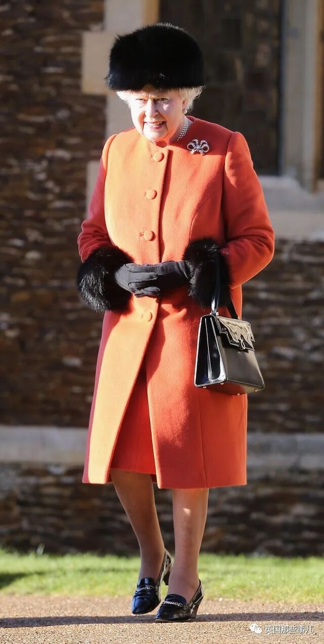 圣诞节这天,女王身穿鲜艳的橙色大衣和连衣裙,以黑色皮草和维多利亚女王的蝴蝶结胸针作为点缀,出席了桑德林汉姆的圣诞节仪式。