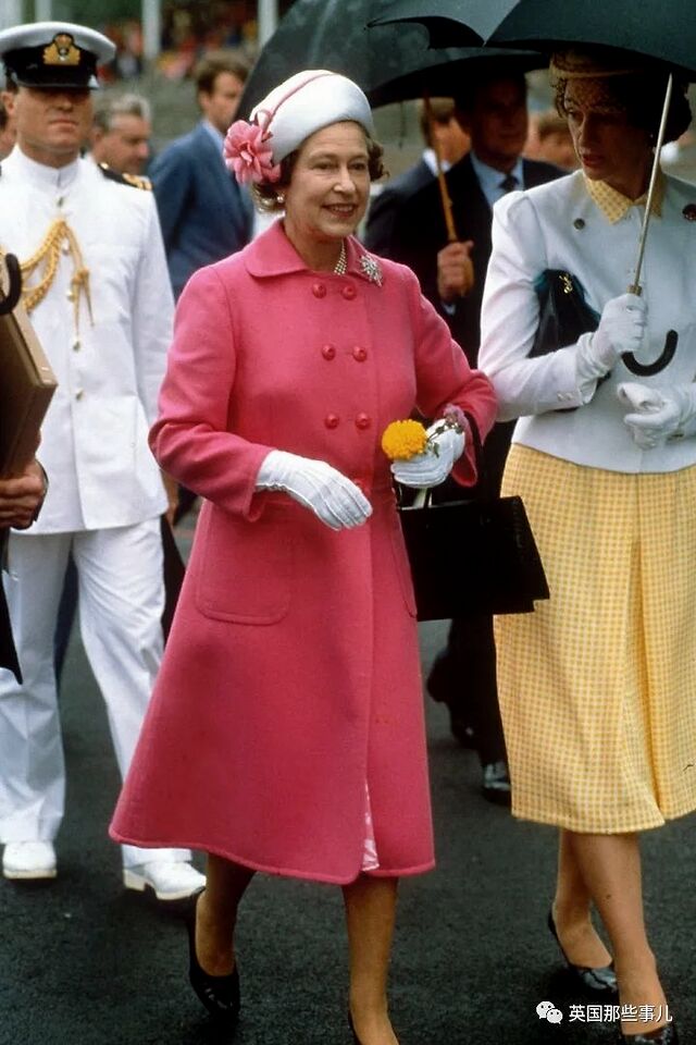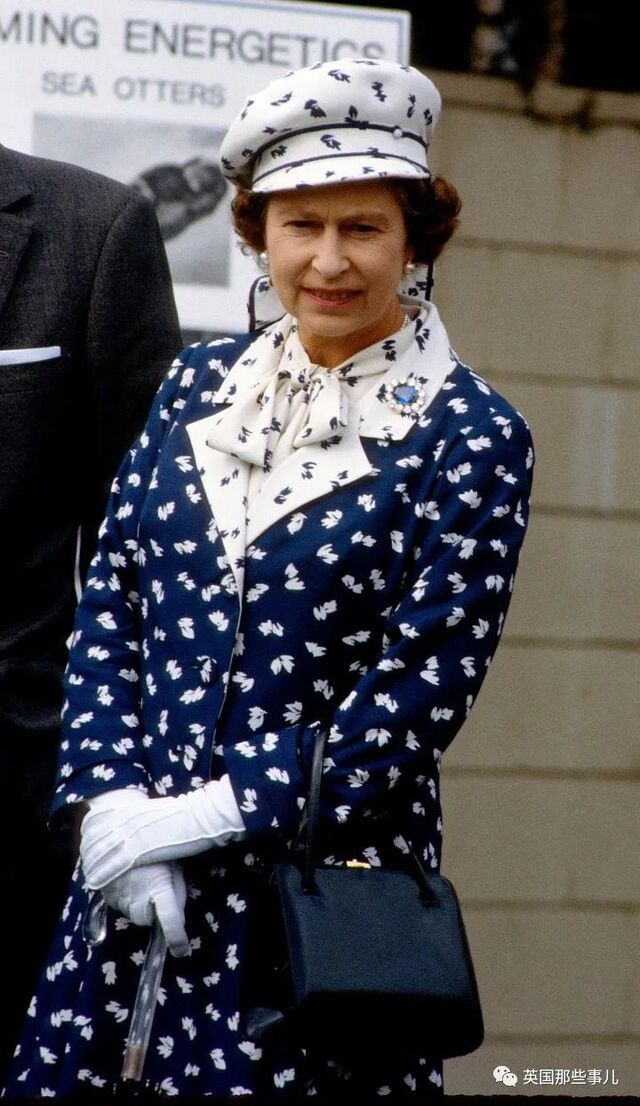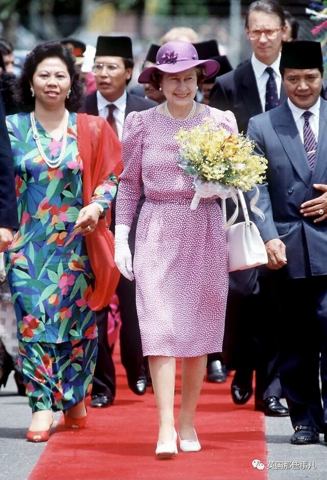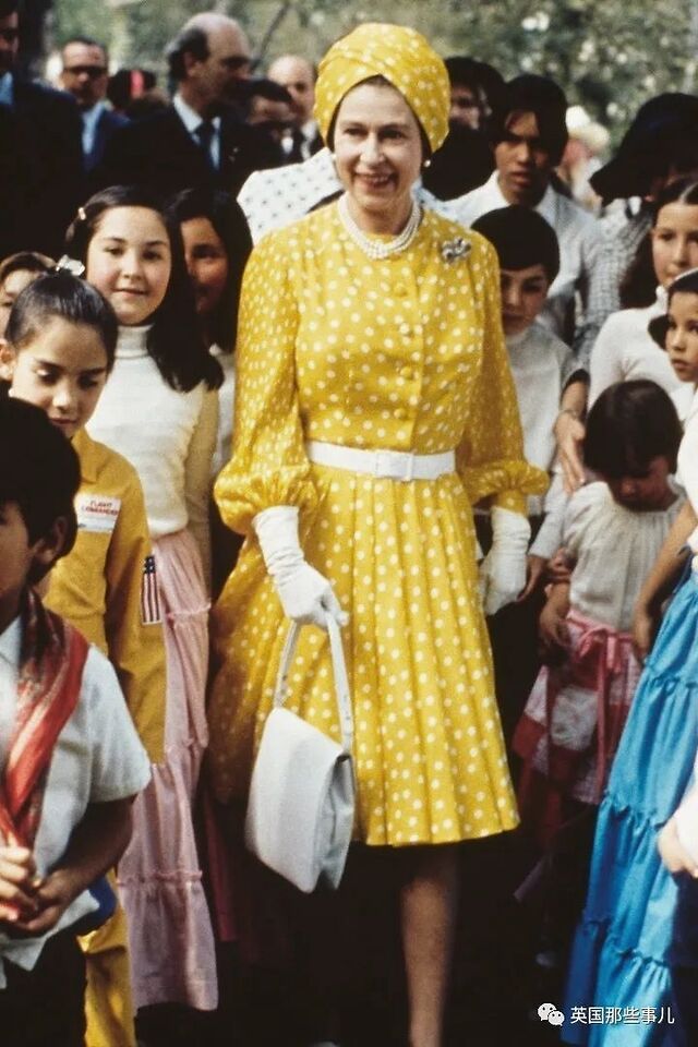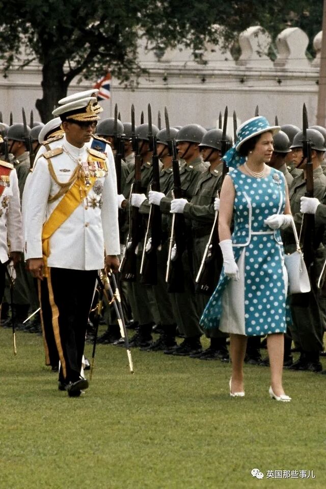 1972年2月,女王伊丽莎白二世与泰国国王阿杜德一起视察泰国军队,她选择了一件波点无袖长裙,在帽子上也用了相同的布料,这也是女王少见的无袖装扮。