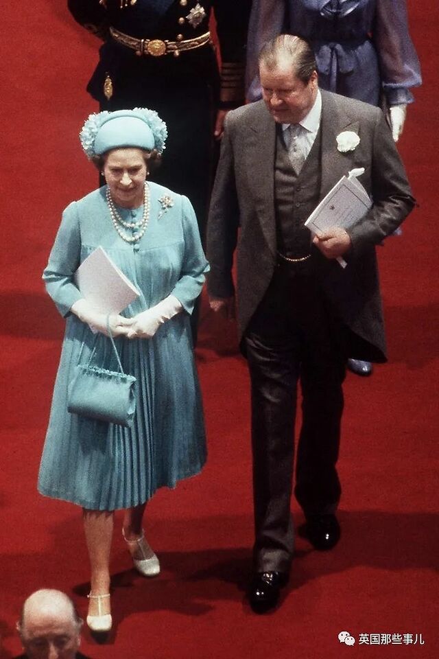 1981年7月29日,女王在圣保罗大教堂参加查尔斯和戴安娜的婚礼时,身穿绿松石褶子礼裙,同样色系的帽子作为点缀。