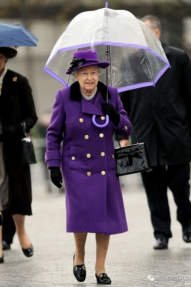 2012年10月25日,女王身穿紫色的双排扣大衣,配上配套的帽子和雨伞,参观伦敦南岸。