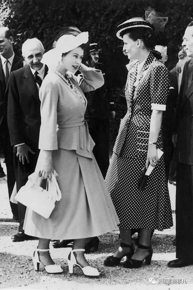 1948年5月,伊丽莎白在法国凡尔赛宫的花园里与法国政要聊天,她穿着Norman Hartnell设计的裙装。