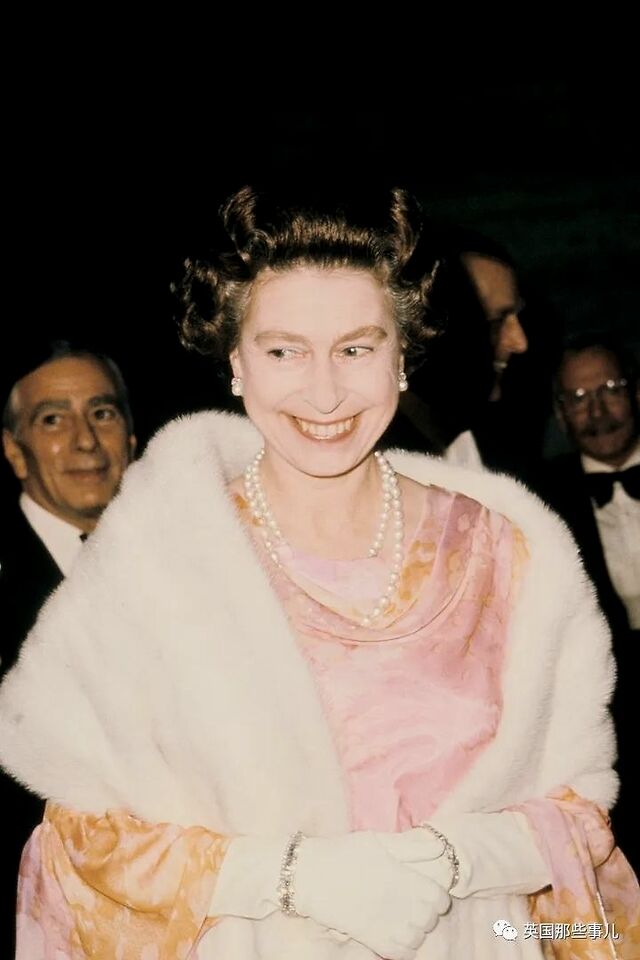 1976年10月,伊丽莎白女王身穿粉橙色长裙,搭配白色皮草披肩和珍珠项链,在伦敦国家大剧院开幕。
