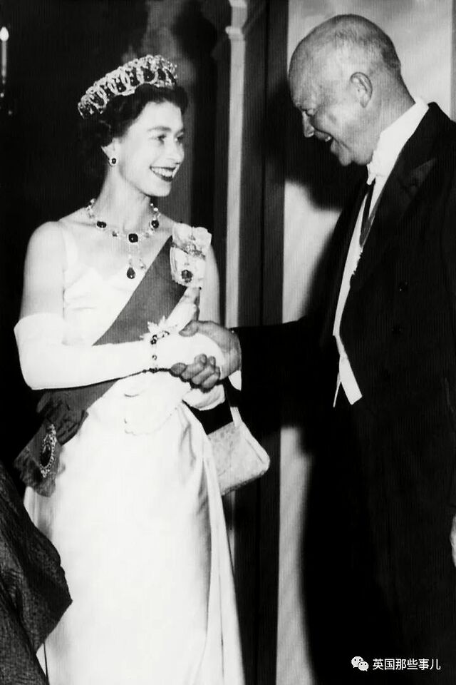 1957年10月,伊丽莎白女王在华盛顿特区的英国驻美大使馆欢迎美国总统艾森豪威尔,
