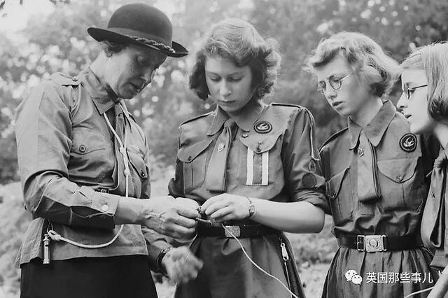 1942年4月11日,伊丽莎白在Frogmore和其他女孩学习如何打结。这张照片拍完后不久,她就被国王任命为手榴弹卫队的上校。