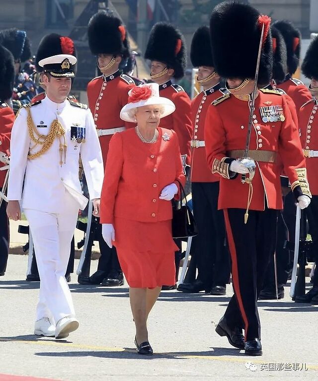 在加拿大日当天,女王身穿红裙套装与卫兵相一致,她还很应景地佩戴了枫叶胸针。