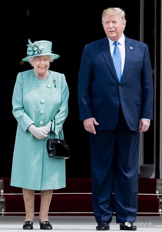 2019年6月3日,女王在白金汉宫接见美国总统特朗普,身穿水绿色大衣,佩戴同系帽子,戴着圆形剑桥绿宝石胸针。