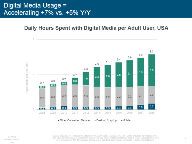 美国人在数字媒体上花的时间达到史上最高峰——2018 年每天 6.3 小时,比 2017 年增长了 7%。其中,移动设备和其他连接设备是增长的最大拉动力,而人们花在计算机上的时间则持续走低。