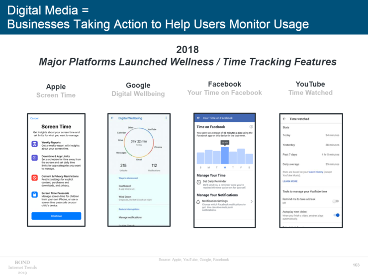 在 2018 年还有一个不可忽视的现象,就是多个科技巨头推出了健康功能,来帮助用户监视数字媒体的使用情况:苹果屏幕时间功能、Google 数字健康功能、Facebook 逗留时间功能,以及 YouTube 观看时间功能。
