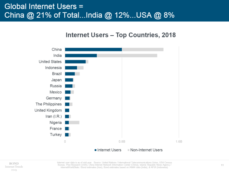 如果从国家来看,中国、印度、美国、印度尼西亚和巴西分别是全球互联网用户最多的五个国家,当然在某程度上这与这些国家的人口基数有关。而从增长潜力来看,中国和印度在互联网用户数量还有很大的增长空间,其中尤以印度为最。