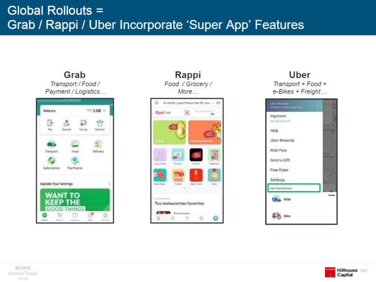 在本地生活领域,中国已经诞生了超级 App,比如说美团、支付宝等,其中,美团将 30 多种以上的本地交易服务纳入到 App 中,达到 4.1 亿的年交易用户,同比增长了 26%。值得注意的是,海外公司也在逐步采用超级 App 策略,比如说 Uber 集成了打车、外卖、自行车以及货运等。