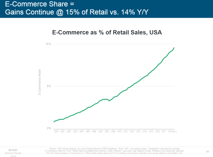 目前,美国电子商务占整体零售业务的 15%,2019 Q1 的同比增长 12.4%,但增长速度也有所放缓;而常规零售 2019 Q1 同比增长仅为 2%。