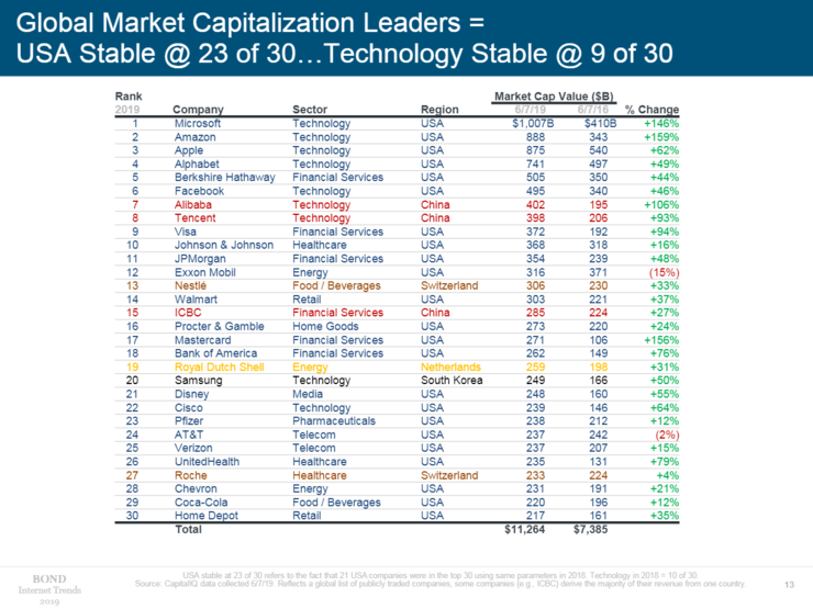 截止上周,全球市值前十的公司中,除了伯克希尔哈撒韦(Berkshire Hathaway)、维萨、强生 3 家公司、其余 7 家都是科技公司,排名从高到低为微软、亚马逊、苹果、谷歌母公司 Alphabet、伯克希尔哈撒韦、Facebook、阿里巴巴、腾讯、维萨和强生。在全球市值前三十的公司中,有 23 家美国公司,而科技公司有 9 家。