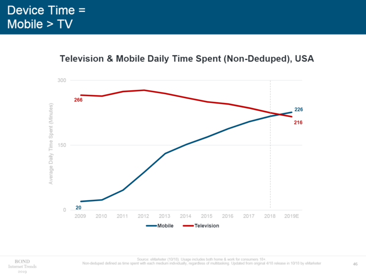 从 2009 年起,美国人每天在移动设备上花费的时间在不断增长,而在电视上花费的时间不断减少,到 2018 年二者已经非常接近。预计在 2019 年,美国人每天在移动设备上花费的时间将超过电视。