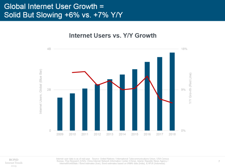 全球互联网用户达到 38 亿,超过了世界人口的半数以上,不过,2018 全球互联网用户的年增长率为 6%,2017 年为 7%,已经明显慢了下来。