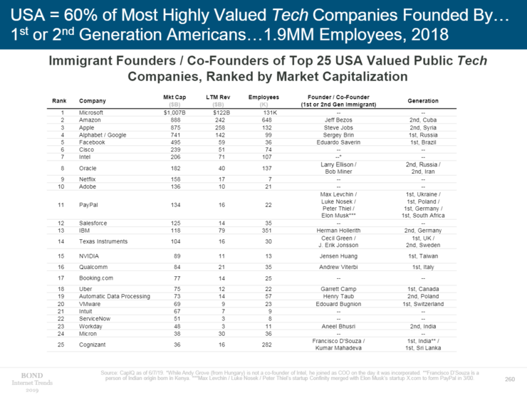 在前 25 名市值最高的的科技公司中,有 15 个是由第一代或第二代移民创立的。新的移民法更加严格,这可能会对科技行业产生负面影响,也许会阻止“下一个埃隆马斯克”进入美国。