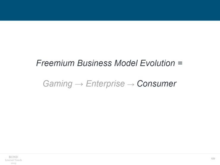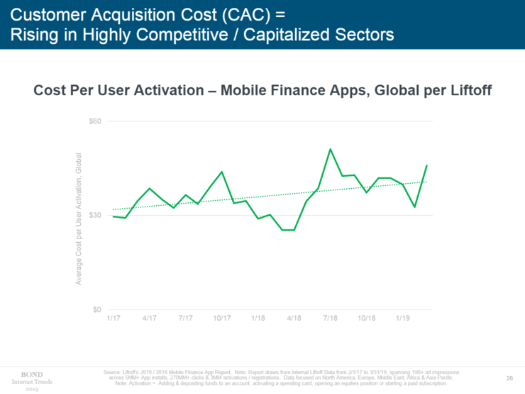 客户获取成本(每吸引一个新客户所需要的营销支出)正在上升,但这种趋势不可维系,因为在某些情况下,客户获取成本超过了客户能带来的长期收入。Mary Meeker 建议,利用成本更低的方式来吸引客户,比如免费试用和免费分级使用。