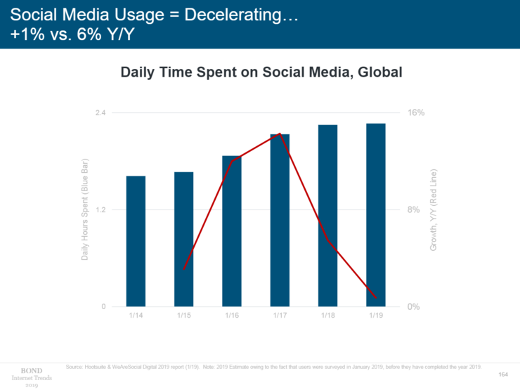 在全球范围内,人们在社交媒体上所花的时间仍在进一步延长,到 2019 年 1 月,已经接近 2.4 个小时;不过整体来看,增长速度已经十分缓慢。