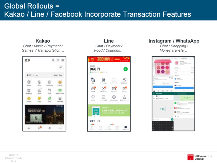 微信通过一系列的产品和技术创新, 实现了基于支付和小程序的服务闭环。目前,海外的互联网公司也在逐步采纳微信的策略,在海外的同类 App(比如说韩国的 Kakao、日本的 Line 和 Facebook 旗下的 Instagram/Whatapp)中,都开始加入交易功能。