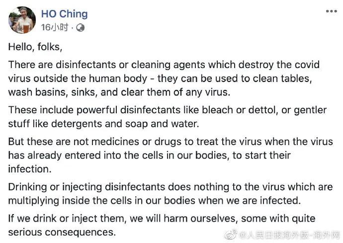 美国总统特朗普23日在白宫记者会上语出惊人,称向体内注射消毒剂或许可以消灭新冠病毒,引发舆论哗然。新加坡总理夫人何晶25日在社交媒体上发文,呼吁民众保持冷静,切勿饮用或注射消毒剂。她强调,如果饮用或注射消毒剂,会对自己造成伤害,其中一些后果非常严重。