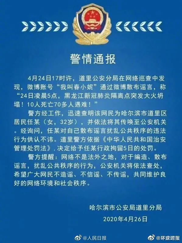 据黑龙江省哈尔滨市公安局道里分局官方微博通报,日前有微博账号“我叫春小妮”散布谣言称“黑龙江新冠肺炎隔离点突发大火坍塌!10人死亡70多人遇难!”,经查为哈尔滨市道里区居民任某(女,32岁)。警方将任某传唤后经询问,任某对自己散布谣言扰乱公共秩序的违法行为供认不讳。哈尔滨市道里警方依据《中华人民共和国治安管理处罚法》,决定给予任某行政拘留5日的处罚。