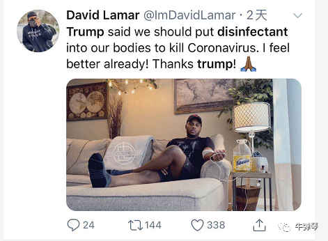 特朗普说,我们应该注射消毒液杀死新冠病毒,我现在感觉好多了,谢谢特朗普!