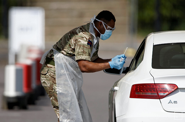 2020年4月24日,一名军人在英国伦敦切辛顿的直通测试站点进行新冠病毒检测(图源:路透社)
