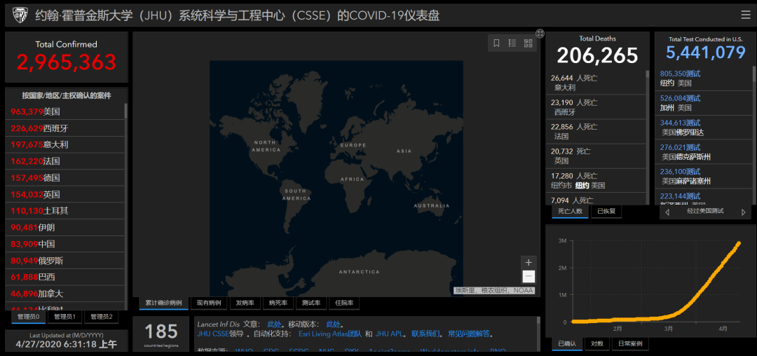 美国约翰斯霍普金斯大学发布的实时统计数据显示,截至北京时间4月27日6时31分左右,全球累计确诊新冠肺炎病例2965363例,累计死亡206265例。